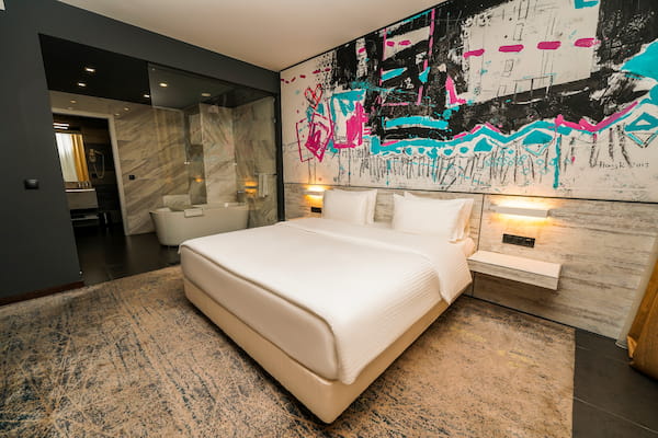 В номерах над изголовьем — огромные абстрактные полотна художника, а также соавтора и архитектора этого проекта — Айка Хачатряна, будто замёрзшие взрывы галактик. Они —не просто декор: каждый из них — голос космоса, внезапный визит сквозь уютное одеяло.