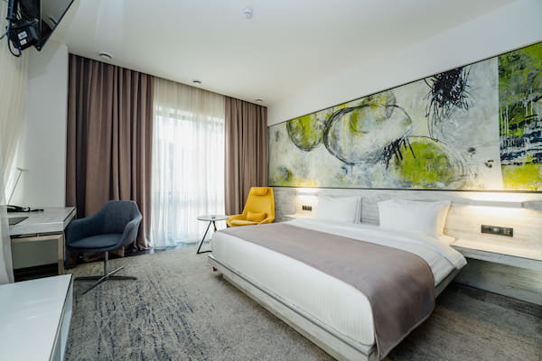 Этот космический корабль, приземлившийся прямо в сердце города, предлагает не только дизайн, но и высококлассный сервис: 53 стильных номера (от стандартных до «art deluxe») с балконами и звукоизоляцией; спа‑ и фитнес-центр с бассейном, сауной и массажем; бизнес‑зоны с конференц‑залами;