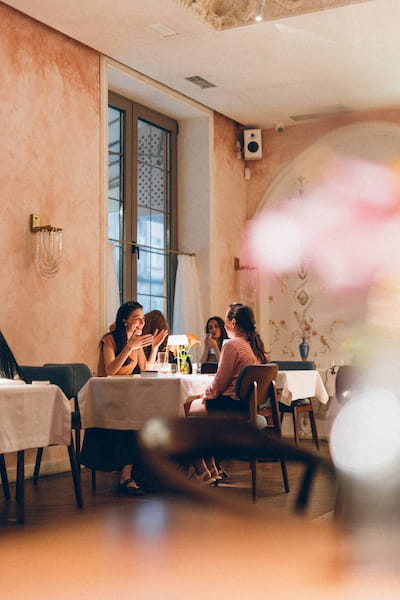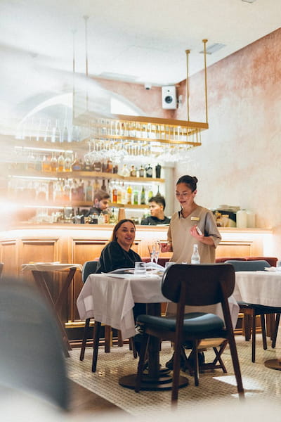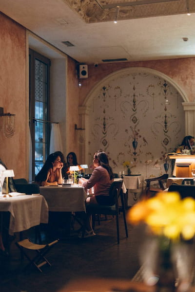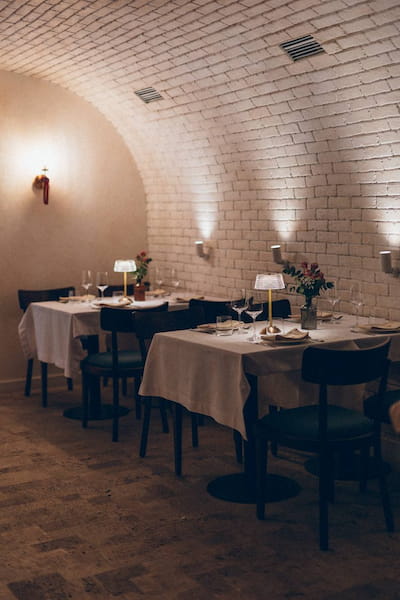 В ресторане несколько зон: основной зал, барная зона и винный погреб — идеальный для частных мероприятий, ужинов и дегустаций. Летом радует открытая веранда.