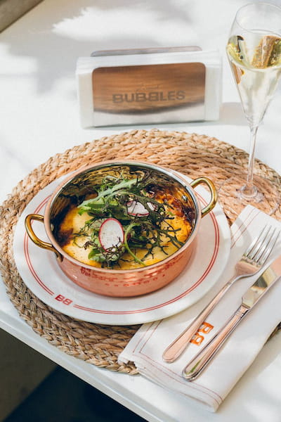 Кухня Bubbles — это не брускетты под просекко. Это полноценная гастрономия. Более 60 позиций в меню сочетают традиции европейской кухни с авторским взглядом. Классика подаётся с акцентом на текстуры и сезонные продукты.