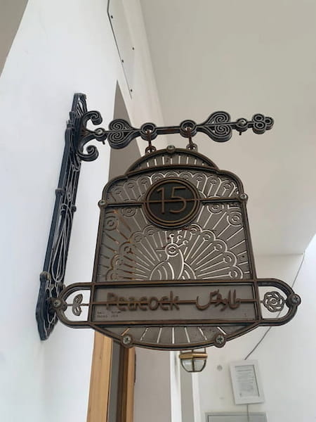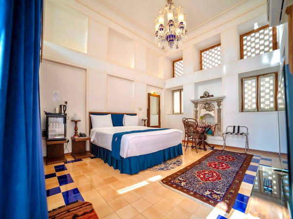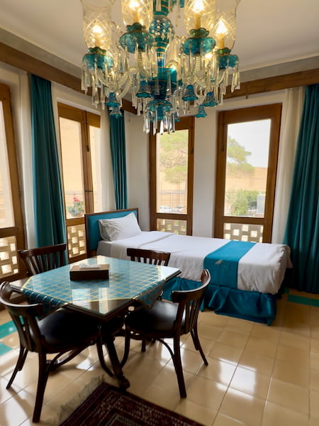 Комнаты окрашены в изумрудный, бирюзовый, шафрановый, цвета нефрита и закатного неба. “Каждая сторона отеля — свой цвет. Свой смысл. Свой путь”. Цвет здесь проявлен только в стенах — он в текстиле, в ручной плитке, в рисунках ковров. Как сказка, спетая через форму. На стенах в номерах также много «фарзанех» — изображений цветов и птиц — также традиционное для иранской культуры.