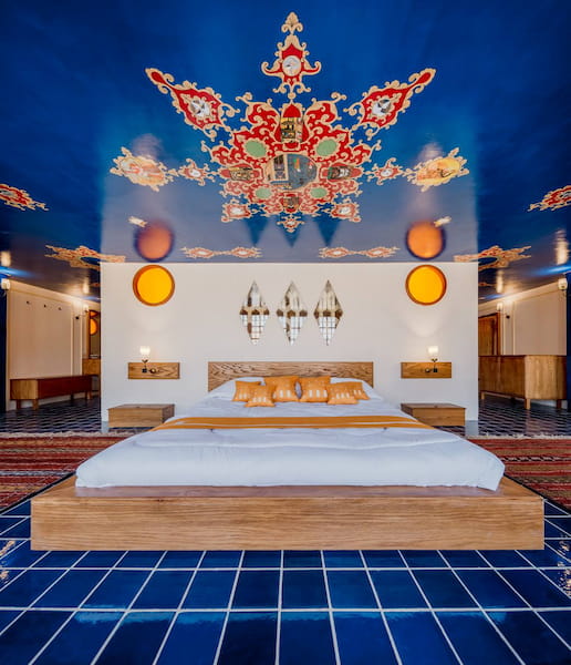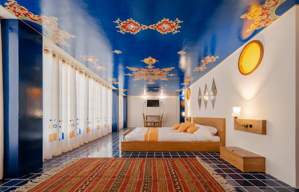«Мы расположились рядом с площадью Накш-э Джахан — вторым по значимости памятником Ирана после Персидского дворца в Ширазе. Поэтому идея создать здесь пространство, вдохновлённое эпосом «Шахнаме» Фирдоуси, казалась естественной. Каждая комната носит имя героя или героини этого великого произведения — Рудабех, Заль, Гиф, Сохраб… Например, комната Рудабех — это верхний этаж с потолком в лазурных тонах, символизирующая могущественную мать героя Рустама».