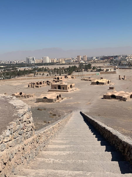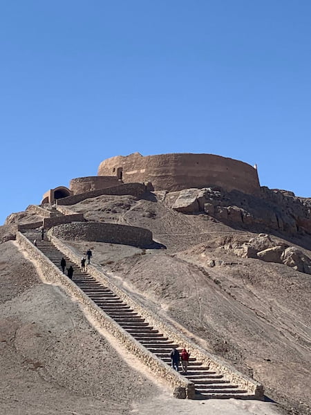 На следующий день мы отправляемся знакомиться с наследием зороастрийцев и начнем его с Башни молчания, расположенной на окраине на холмах Язда. Tower of Silence — место, где зороастрийцы прощались с умершими. Согласно древней традиции, тела оставляли на вершине башни, чтобы птицы — в первую очередь, грифы — очистили кости, которые потом складывались в специальные хранилища.