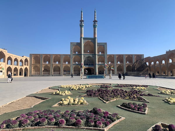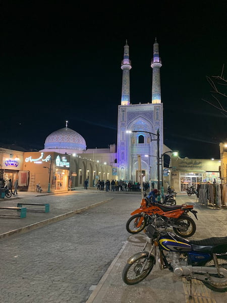 Площадь Амир Чахмагх оживает ближе к вечеру. Массивная арочная фасадная стена словно сцена, на которой разворачивается жизнь: дети бегают с мороженым из розовой воды, старики ведут неторопливые беседы, а туристы заворожённо любуются подсветкой, превращающей архитектуру в золотое кружево.