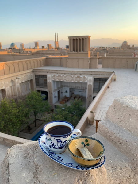 Лучший кофе в городе я нашла в маленьком кафе неподалёку от комплекса Амир Чахмагх — здесь подают кофе по-яздски с розовой водой и смесью тёплых специй. Он пахнет, как утренний рынок пряностей, и согревает так, что вспоминаешь его вкус ещё недели спустя. Его варят несколько часов, и, кажется, что как и Язд, он рассказывает свою историю.